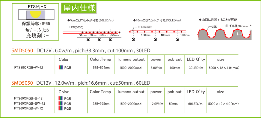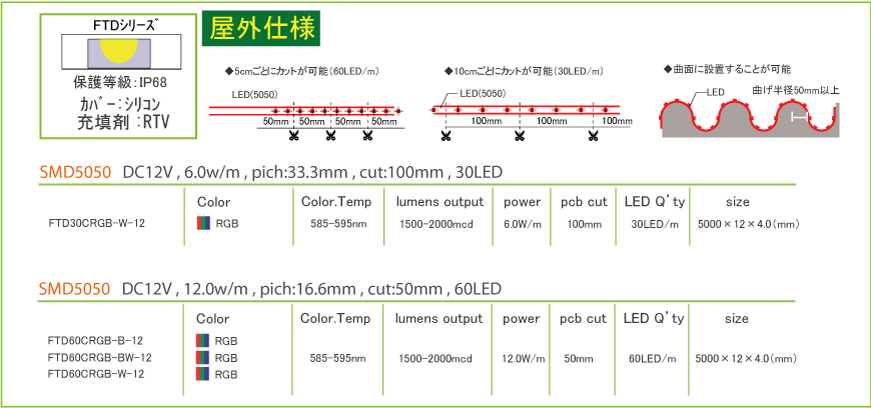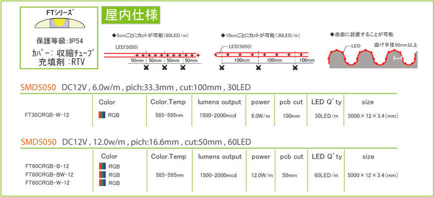 フルカラータイプのテープLEDです。基板の色は全体の色を輝かせる白色と、演出効果を期待する黒基板をラインナップ化しています。IP54はクリスタルドームタイプの薄型で綺麗な色合いを長期間演出できます