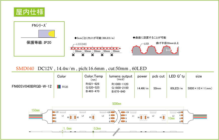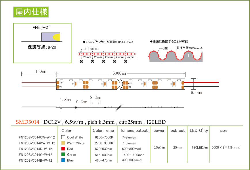 これまでご紹介してきました製品は全てTopViewタイプでしたが、ご紹介するLEDテープは、横方向に光を出すSideViewLEDチップを搭載することでフレキシブルに曲げることができます。 今まで出来なかった細い隙間に設置したり、文字を作ったりすることも出来るようになりました。製品ラインナップは、白をはじめ、電球色、色物からフルカラーまで取り揃えています。